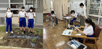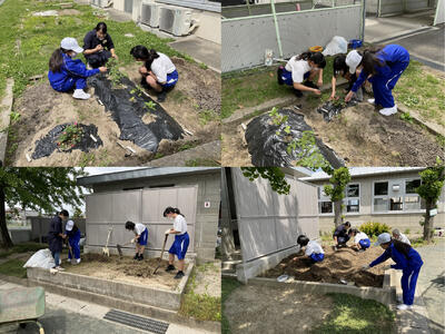 ミニトマトとナス、パプリカの苗を植えました。教室では、スプラウトの育成で、ブロッコリーの種をまきました。観察と記録、管理作業をしっかりして大切に育てましょう。