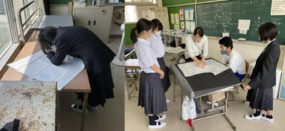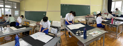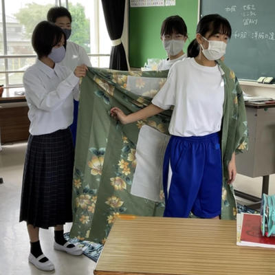 日本の衣文化の学習で浴衣を着ました。教科書のQRコードを読み取ると、着方(男女版あり)やたたみ方の動画を見ることができます。家で着る機会があったらチャレンジしてみましょう!
