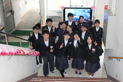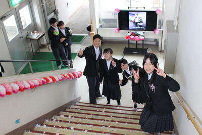 祝う会では、みんなでできるゲーム(卒業生福笑い、ジェスチャーゲーム、はじめの一歩)をしたり、お祝いの色紙や記念品を渡しました。また、卒業式では、最後に盛大に笑顔で見送ることを計画しました。そして在校生の気持ちが卒業生を笑顔にし、心に残る見送りができました!!