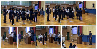 児童会、生徒会役員認証式では、各部の会長が代表して抱負を発表しました。中学部の会長は一芸でみんなを笑わせ、「笑顔、優しさ、夢のあふれる学校」に向けて、すばらしいスタートを切ってくれました。