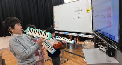 鍵盤ハーモニカの立奏に挑戦しました。正しい立位、呼吸、鍵盤ハーモニカを支える力など、