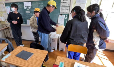 プレゼント交換では、在校生からは折り紙で作った猫のネックレス、