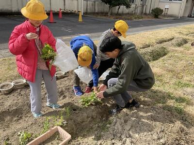 種から育てた大根を収穫しました。今度は、6年生の理科の学習に向けて、じゃがいもの種芋を植えます。