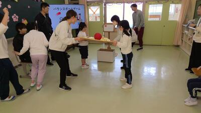 卒業生と一緒にボール箱入れゲームをしたり、乾杯をしてお菓子を食べたりしました。