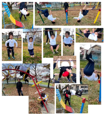 得意な技を披露しました。これまでの練習で、体を動かすコツが分かり、鉄棒から落ちないように親指をかけたり、肘を曲げて体を引き寄せたりすることなどを身に付けながら、いろいろな技に挑戦することができました。発表の後には、友達から、「おー」と拍手してもらい、少し照れた表情の決めポーズもステキでした。