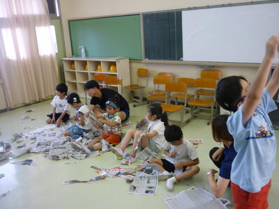片付けも協力して、みんなで袋に新聞を集めることができました。