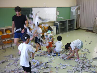 シャボン玉遊びをする予定でしたが、外がとても暑かったので、急遽変更して新聞遊びをしました。