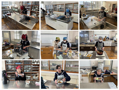 自分で決めた献立のチキンソテー、肉じゃが、豚肉のしょうが焼きを作りました。味付けや火の通り具合、盛り付けはもちろん、生ごみの処理やごみの分別などの片付けまでしっかりしました。これからも、おいしい料理で周囲の人も笑顔にしましょう。