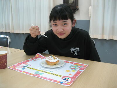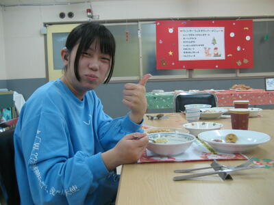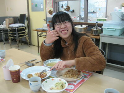 今年度は、小学部1名と高等部1名の卒業のお祝いをしました。第1部では、「今年度の思い出」を振り返るスライドを見てから、在舎生から卒業生へのインタビューを行い、指導員からお祝いの言葉を贈りました。第2部では、お祝いのメニューをおいしくいただきました。その後、みんなでゲームを楽しみました。とても素敵な行事でした。