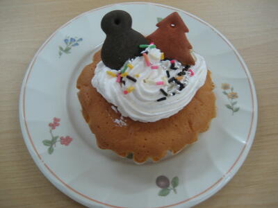カップケーキに好きなホイップクリームとトッピングのクッキーをのせたら出来上がり!