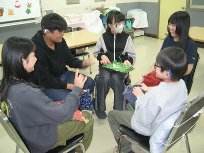 音楽に合わせて隣の人へプレゼントを回して音楽が止まったらプレゼントがもらえるよ。