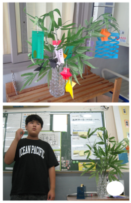 係の舎生が「七夕」について調べたことを発表した後、短冊にみんなそれぞれ願い事を書きました。