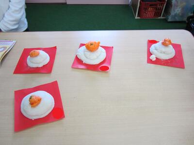 つきたての おもちを まるめて おしょうがつに かざる 「かがみもち」を つくったよ。