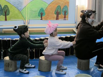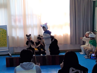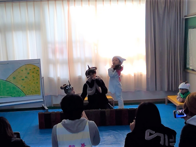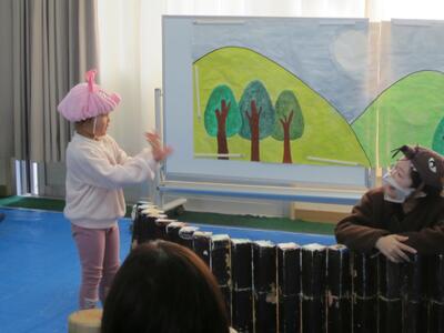 じぶんが すきな どうぶつに へんしんして、ぶたや わに、おおかみみたいに あるいたり、おぼえた せりふを いったりして、たのしく はっぴょうが できたよ。