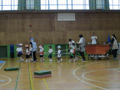 さいしょに、ぞうぐみさんが おみこしを かつぎ、ぱんだぐみさんと うさぎぐみさんが おししや うちわを もって、「わっしょい、わっしょい」の かけごえに あわせて ねりあるきを しました