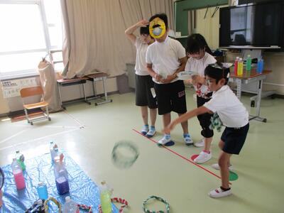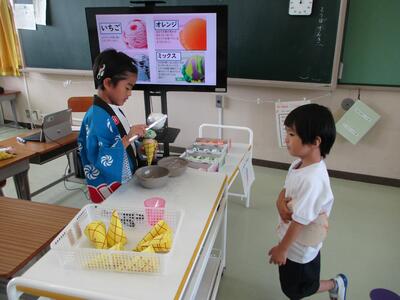 生活単元学習の授業で夏祭りを行いました。お店はアイスクリーム屋さんとお面屋さんと輪投げ屋さんです。