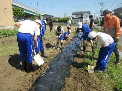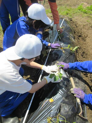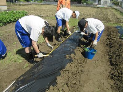 畝を作って、雑草が生えないようにマルチをはって、苗を植えました。暑い中、頑張りました。苗の植え方もネットで検索して調べました。8mの畝にメジャーを置いて、40cm間隔で植えていきました。