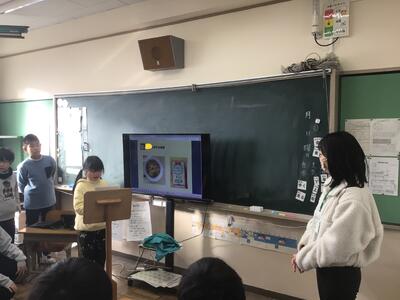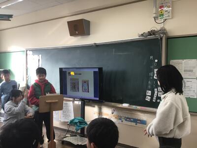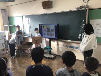 栄養教諭の先生に、委員会から好きな給食を発表したあと、感謝の気持ちを伝えました。